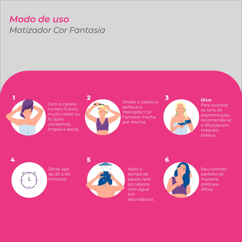 ATENÇÃO: A intensidade da cor irá variar conforme a altura de tom obtida na descoloração e a porosidade do cabelo. Para que a cor seja mais fiel é necessário que o clareamento esteja no tom 9 (loiro muito claro) ou 10 (loiro claríssimo).